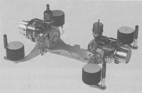 如圖4所示,在第三種傳動形式的基礎上,差速器被兩個獨立的牽引電機所代替。每個牽引電機單獨完成一側車輪的驅動任務,即無機械差速器的傳動形式。在車輛進行曲線行駛時,兩側的電機就會分別工作在不同的速度下。圖5顯示的為雙電機驅動模式下的底盤結構。前軸兩個半橋上分別用一個電機驅動一側車輪的行駛,但是控制難度較大。圖5所示為ZF研發的雙驅動電機驅動橋結構,驅動電機置于兩側,分別控制、驅動兩側車輪。這種驅動橋間沒有大型的差速器橋包,因此可以降低質心。