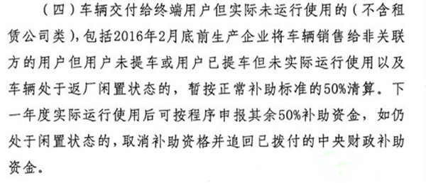 據(jù)此可以推測,近日流傳出的“閑置車輛信息參考表”即為2016年9月專員辦檢查及各地方政府復(fù)查出的“閑置車輛”信息匯總。此番再次發(fā)布《關(guān)于報送2015年度新能源汽車閑置車輛情況的通知》,是要求對認(rèn)定為閑置情形的車輛運(yùn)行情況進(jìn)行核查確認(rèn)。而后,四部委會根據(jù)反饋信息形成終關(guān)于“閑置車輛”問題的確定,并按照出售對象是關(guān)聯(lián)企業(yè)而非終端用戶且閑置的車輛不予以清算,對出售給非關(guān)聯(lián)用戶但處于閑置狀態(tài)的車輛按正常補(bǔ)助的50%進(jìn)行清算。