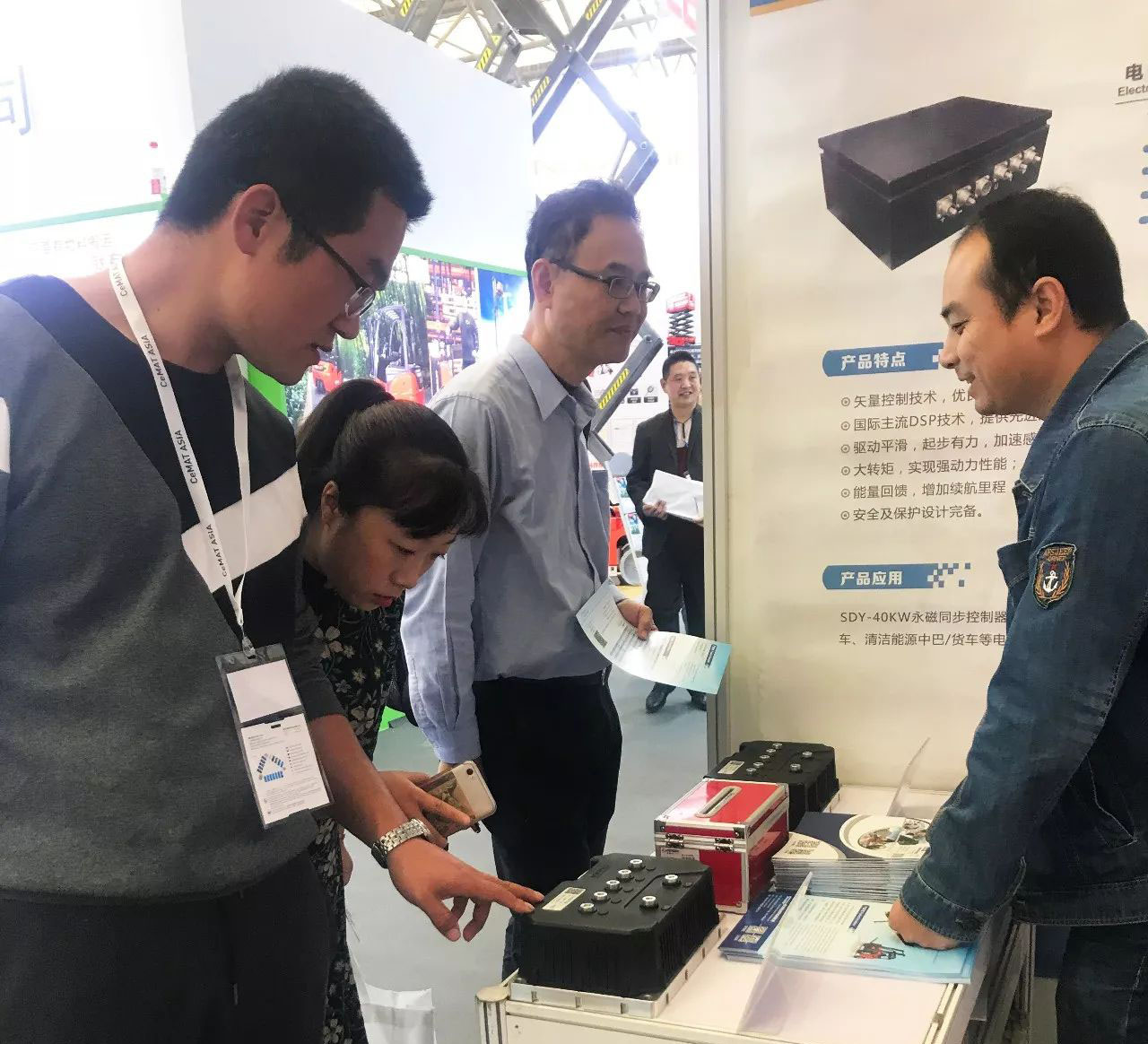此次展會重點展出了我司新研發的SCJ系列控制器SCJ系列是針對叉車開發的交流異步電機控制器。應用了先進的矢量控制算法和MOSFET驅動技術,采用CAN總線或無線藍牙通訊方式,可通過電腦或手機平臺對控制器實現編程及監控;本機具有電機自動匹配功能,能使電機以高效率運行;具備短路、過載、過溫、高低壓等多重保護功能。